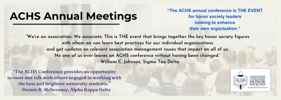 The Association of College Honor Societies (ACHS) is the organization honor societies join when they want their society certified by a neutral body, want to collaborate with other honor societies to promote best practices in recognizing and promoting excellence in scholarship, leadership, service, and research, and seek to continually maintain the highest standards by providing annual reports and undergoing regular re-certification. Founded in 1925, ACHS is the only certifying agency for college and university honor societies. ACHS sets the standards for organizational excellence and scholastic eligibility, as well as assuring member participation in governance so that the interests of individual members are advanced.